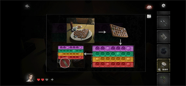 走进第一个房间,里面摆放着2个桌子。有1个男孩会取走你的书。第二个桌子上设有一个游戏,线索就藏在旁边的饼干上。依照饼干上的凸起点亮珠子,你会获得1个木块拼图,以及一个连我都不会解的物品(推荐观看相关视频!),之后还能得到1个钻石糖。
