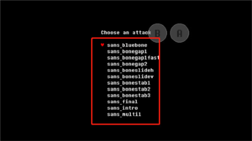 6、下图皆为“sans_bluebone”地图下的表现,触碰蓝色骨刺可恢复血量,触碰白色骨刺将失去血量。